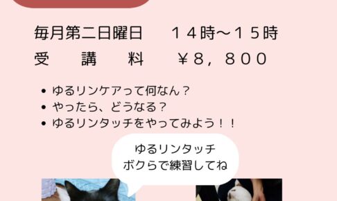 こんにちは、ゆるリンケアセラピストの赤ツナギです。 定期講座である『はじめてのゆるリンケア講座』を4月12日に開催しました。 受講者さんは2名。どちらも、猫さんと暮らしている方で、思いの外、楽しい時間となりました。 &n…